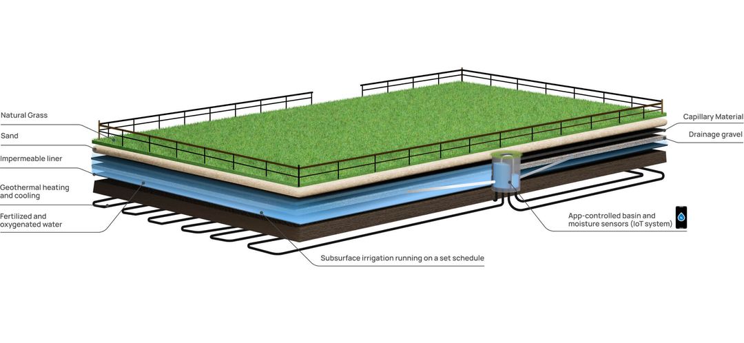 Using an enclosed system with natural sand and underground basins, it filters all water naturally from air and water pollution and then collects it to be reused. By using subsurface irrigation and distribution of fertilizers and pesticides in the water there is no leaching of harmful substances or microplastics into adjacent soil, surrounding water streams or groundwater.