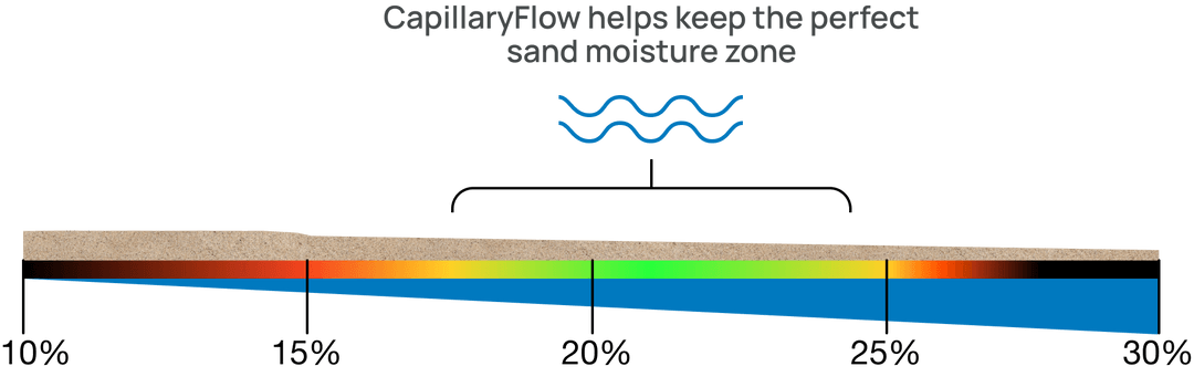 Independent studies indicate that Capillary Hydroponics has 85% less water consumption than traditional overhead irrigation. By both collecting rainwater and irrigating from below there is less surface water, reducing evaporation which in total decreases water loss and consumption. By not using overhead irrigation moisture level is also held consistent with your preferred profile for your sand and grass.