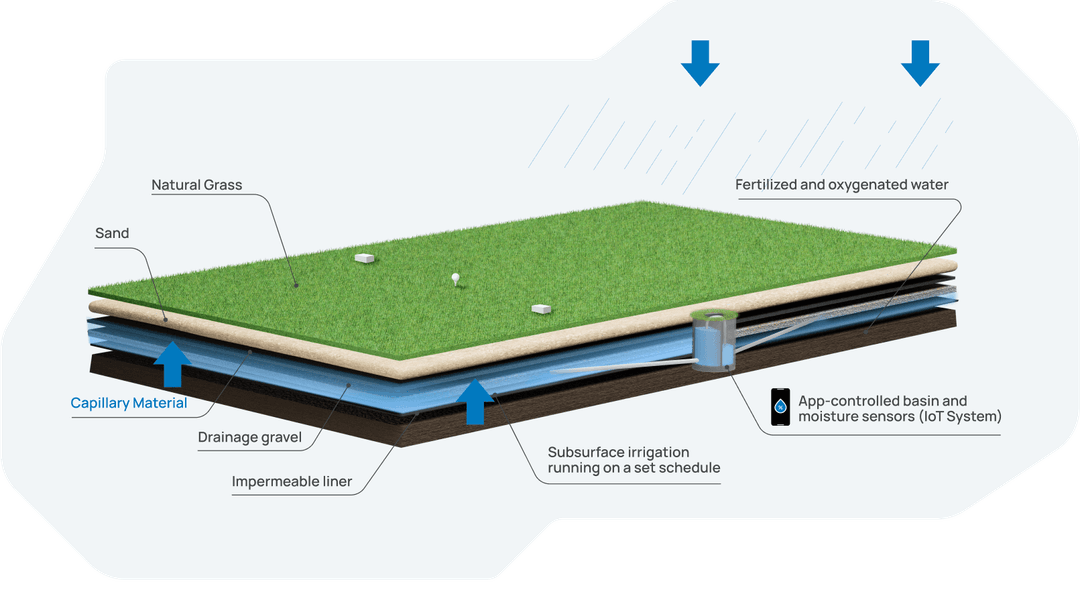 The Capillary Hydroponics system enables us to grow strong and durable grass with significantly less maintenance and environmental impact